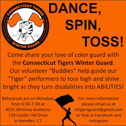 Now entering their 21st season, the CT Tigers is a color guard for performers with special needs. Their performers are assisted by volunteer “buddies” who join them every week to share their love of the activity. Everyone involved has such a positive experience working with the Tigers and building connections means so much to all! For more information please review their flyer for the 2026 season here.