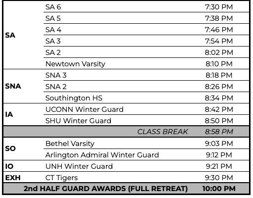 Friendly reminder: Penalties will be issued for ensembles using airborne items (i.e. confetti, streamers, etc.) that require additional time to pick-up at the conclusion of your performance if it delays the next performing ensemble.